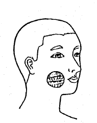 最初は、口辺に黒い物がプッと出来、迅速に悪化して孔があき、頬の肉が、大きいのは鶏卵大にも欠除して了ふので、其結果、口中全部が露出する。歯や舌など全部見えるのであります。実に物凄く正視出来ない位で、横からみますと、右図のやうになります。